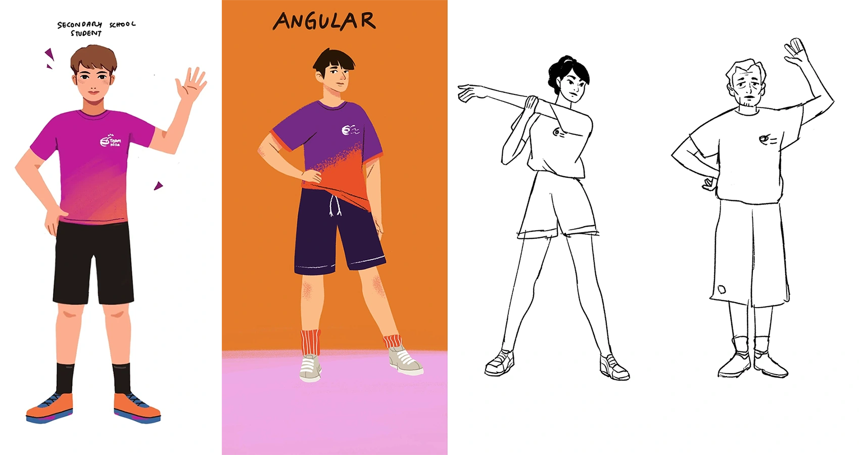Left, a sample character I drew for the style guide. Right, Illustrator Xiao Ming's character design explorations.